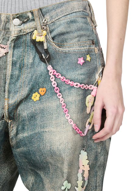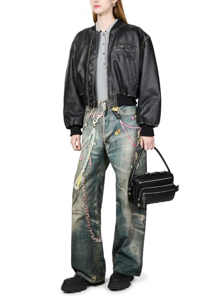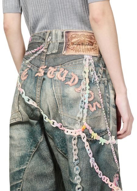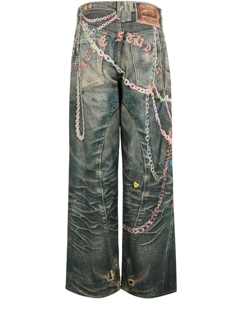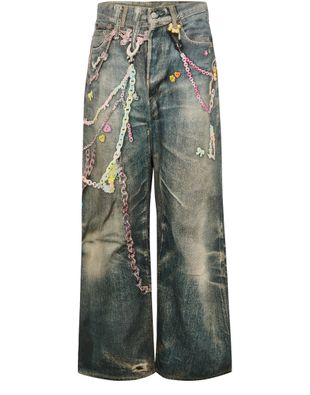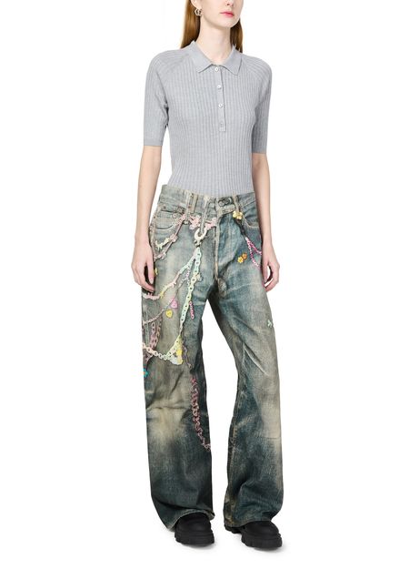 Description : buttoned and concealed zipper closure, visible stitching, five-pocket style, denim, back leather logo, loose fit, belt loops, ankle length, low-waisted fit.