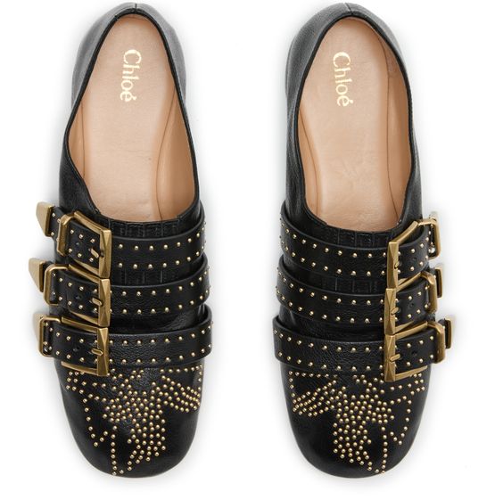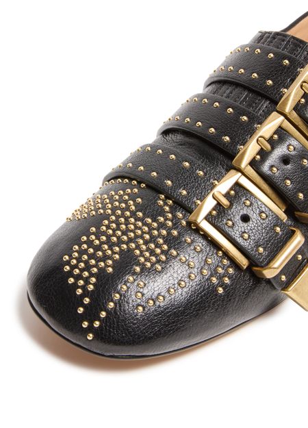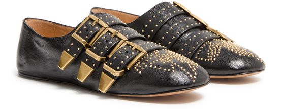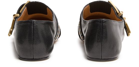 Reveal Chloe's grained leather loafers, designed with a pointed closed toe and a refined buckled strap. Studded accents and the brand's signature buckle add a modern edge, while the gold-finish hardware and logo on the tongue elevate these loafers for a polished, standout look.