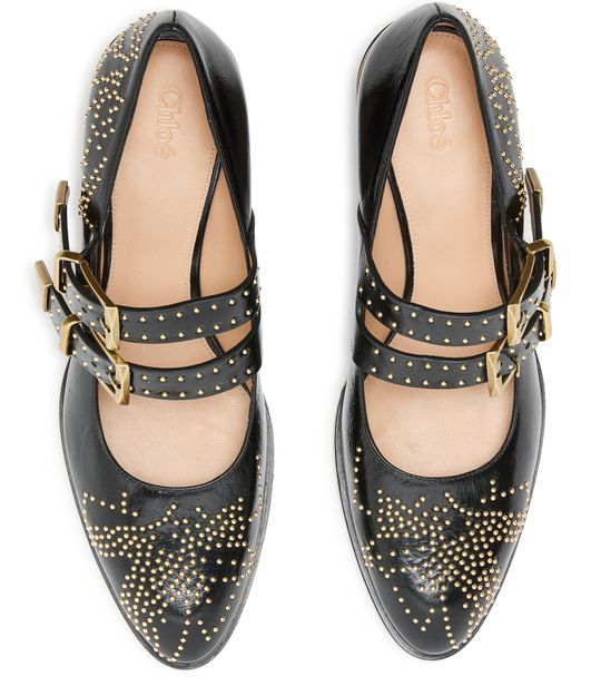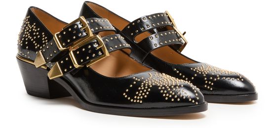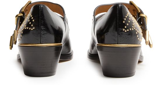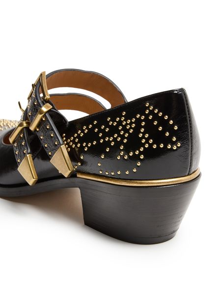Reveal Chloe's Susan pumps, crafted from patent leather with a sleek pointed toe and a secure buckled strap. The medium block heel ensures comfort, while gold-finish studded details add a refined edge. These pumps are a modern statement for any occasion.