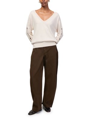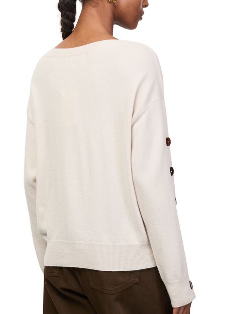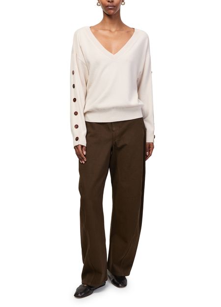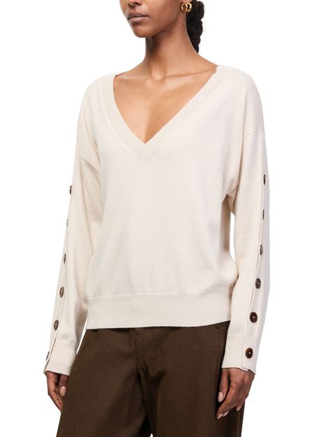 Reveal Bompard's cashmere sweater with buttoned sleeves, featuring a refined V-neck and long sleeves with distinctive button accents. The soft texture and tailored silhouette make it a versatile piece, perfect for layering or wearing solo for a polished, contemporary look that transitions seamlessly from day to night.