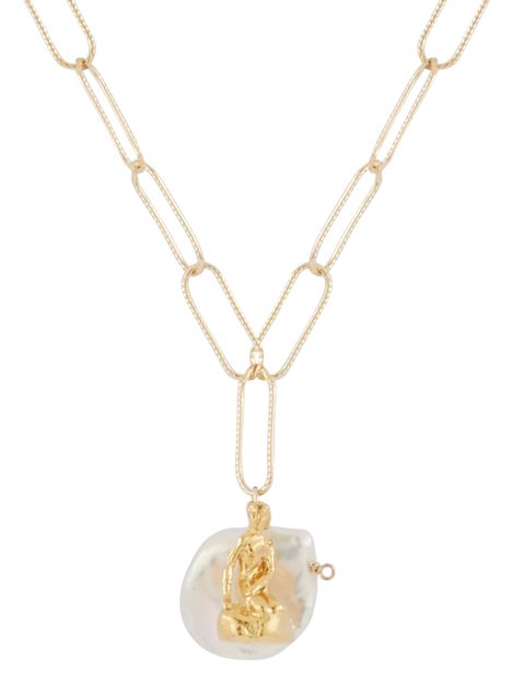 Alighieri has signed the Tales of the Sea necklace. This gold-plated bronze jewel features a chain with large links. At the end of the central link are two charms, a freshwater pearl and the representation of a mermaid. These elements refer to one of the 100 poems in Dante Alighieri's "Divine Comedy" where the mermaid represents the thirst for knowledge.