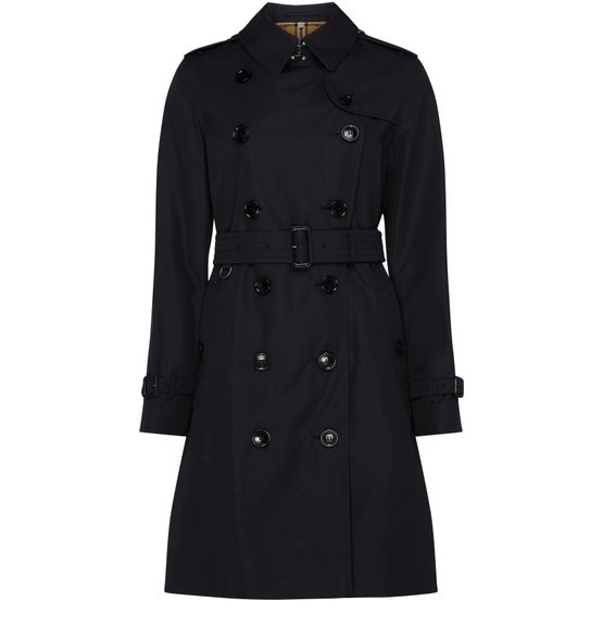 Mid-Length Kensington Heritage Trench Coat is a timeless wardrobe staple. This knee-length, double-breasted coat features a classic collar and long-sleeved design. The front buttoned closure and notched collar add sophistication, while the logo at the back label adds a touch of luxury. Perfect for completing any stylish look.