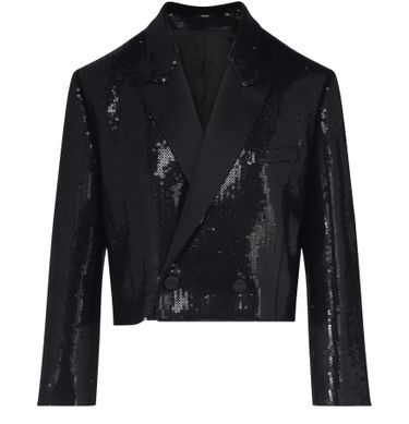 • Description : all-over embroidered sequins, classic fit, cropped length, tailored with front panel and shoulder pads, satin peak collar, 1 chest pocket, inside pockets, 2 satin buttons, 4 satin buttons on the cuffs, reference : 2v28j028r.