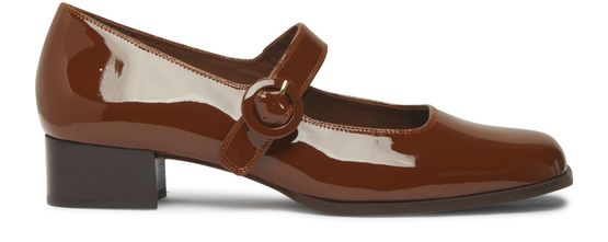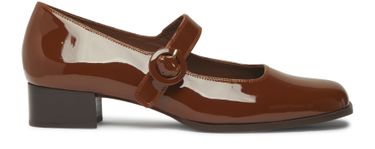 • Description : Pumps, patent leather, buckled strap, logo-printed insole, block heel.