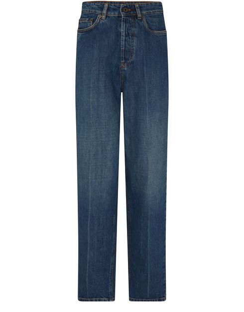 Miu Miu's Wide-leg jeans showcase a straight cut with an ankle length, perfect for effortless style. The five-pocket design features belt loops and a buttoned, concealed zipper closure. Adorned with an appliquéd logo and visible stitching, these jeans blend classic craftsmanship with modern flair, elevating any casual ensemble.