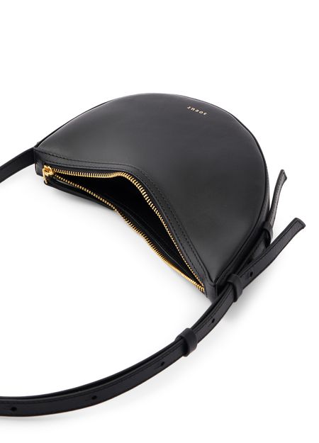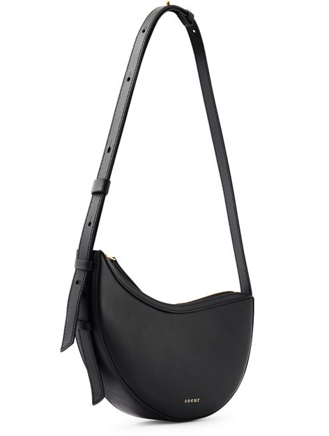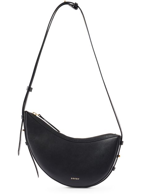Unveil Soeur's Wino mini hobo bag, blending sleek design with practical elements. This bag features a zipper closure, gold finish, and a leather handle. Its adjustable strap allows it to be worn on the shoulder, while the front logo in gold letters and visible topstitching add a refined touch.