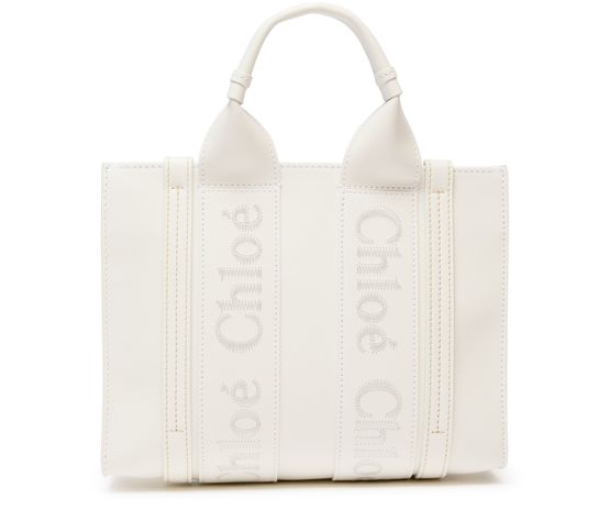Chloe's Woody small tote bag is a stylish and versatile accessory that features a leather shopper design with two handles and a thin strap for wearing on the shoulder or in the hand. The bag is adorned with a jacquard logo and visible topstitching, and it is lined with an interior patch pocket for organization.