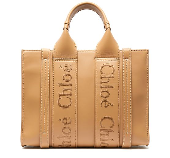 Chloe's Woody small tote bag is a stylish and versatile accessory that features a leather shopper design with two handles and a thin strap for wearing on the shoulder or in the hand. The bag is adorned with a jacquard logo and visible topstitching, and it is lined with an interior patch pocket for organization.