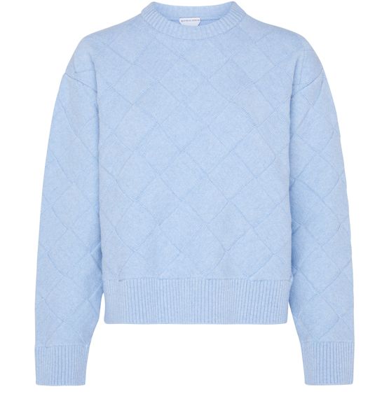 Bottega Veneta's knit sweater features the brand's signature Intrecciato effect, giving it a unique and luxurious textured look. With a tailored fit and ribbed details, it offers a sophisticated silhouette. The round neck and long sleeves add to its classic and timeless appeal, making it a versatile and stylish wardrobe essential.