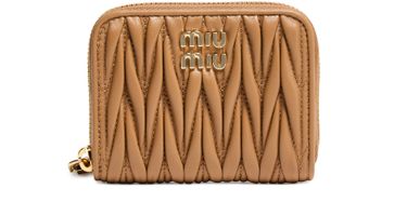 • Description : Wallets, metallic "miu miu" lettering, signature quilted herringbone detail, interior slots for cards, zipper closure, visible topstitching, front logo, gold finish.