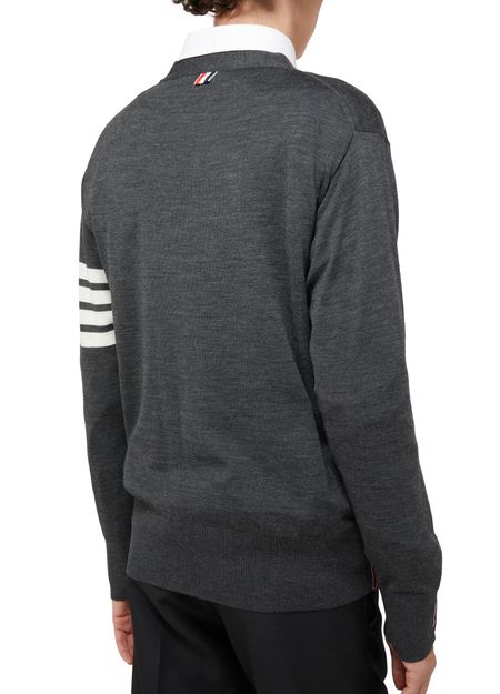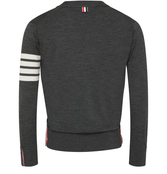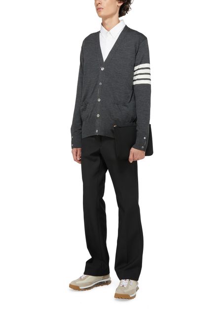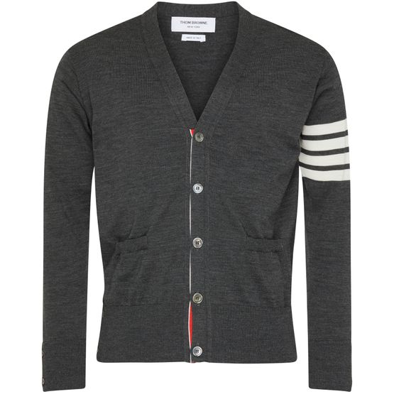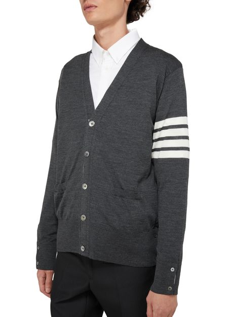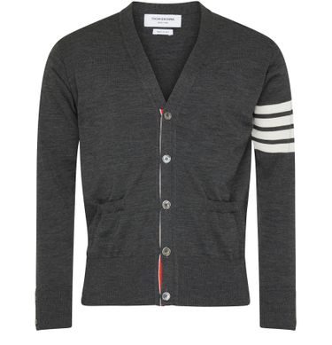 Thom Browne's 4-bar cardigan showcases a slim fit with a refined V-neck and long sleeves. Its buttoned fastening and cuffs enhance sophistication, while the brand's signature motif adds a touch of elegance. Front pockets offer practicality, and the ribbed texture ensures both style and comfort for any occasion.