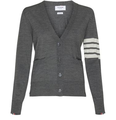 Thom Browne's 4Bar cardigan showcases a warm fabric that envelops you in comfort. Its V-neck design and front buttoned closure add sophistication, while the distinctive sleeve details and buttoned cuffs offer a refined touch. Perfect for layering, this cardigan effortlessly combines style and practicality for any occasion.