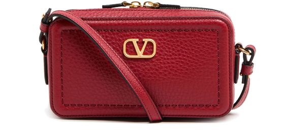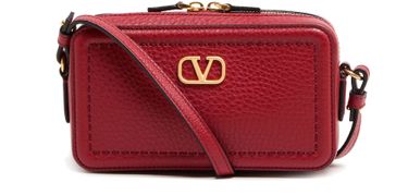 Valentino's Alltime mini camera case is a stylish companion for any adventure. With a zipper closure and single compartment, it keeps essentials secure. Its gold finish and metallic logo on the front exude elegance. The adjustable strap allows for a comfortable crossbody wear, while the thin strap and visible topstitching add a refined touch.