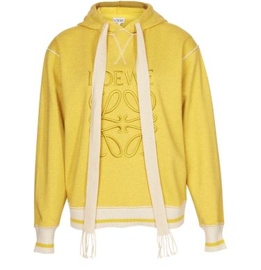 The Anagram hooded sweater is signed Loewe on the front. This cotton piece is enhanced by contrasting bands at the waist and sleeve ends.