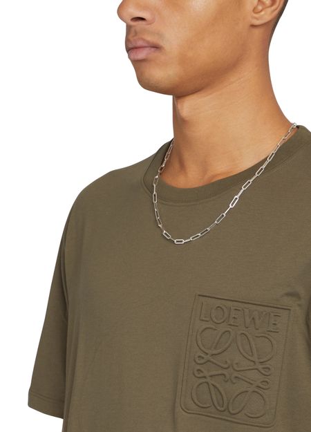 The Loewe Anagram t-shirt is a stylish short-sleeved option with a straight cut and round neck design. It features a chest logo, adding a touch of sophistication to the overall look. This versatile piece can be easily paired with any bottoms for a casual yet trendy outfit.