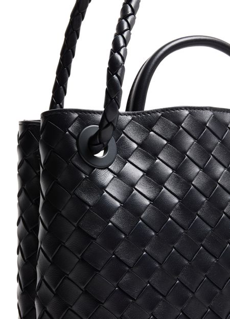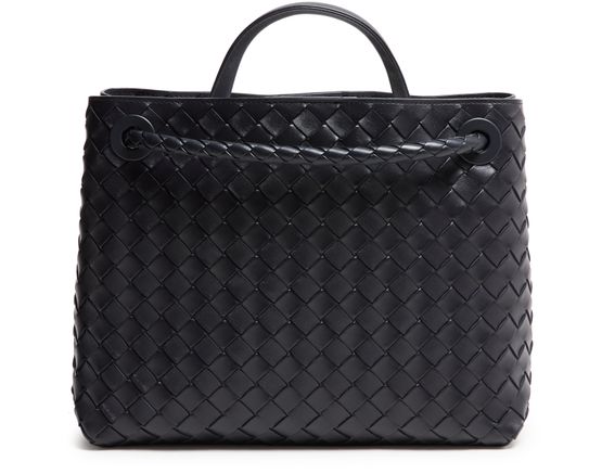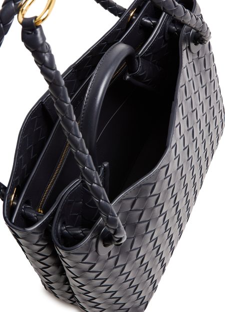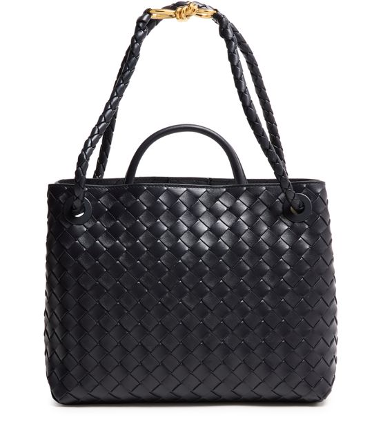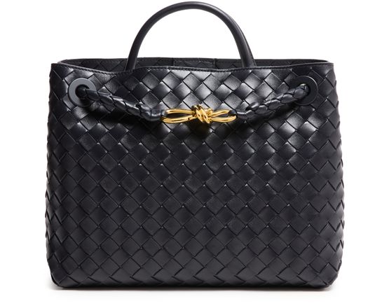 Bottega Veneta's Andiamo bag is crafted from smooth leather using the brand's iconic Intrecciato weaving technique. It features a practical handle, thin strap, and golden finish. Versatile and stylish, it can be hand carried, worn on the shoulder, or across the body, making it a perfect accessory for any occasion.
