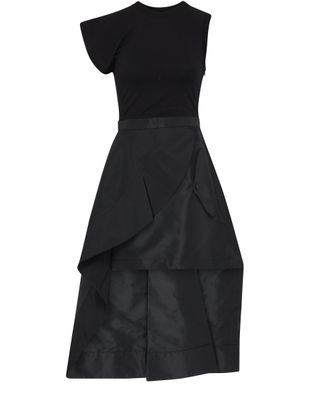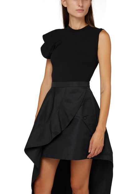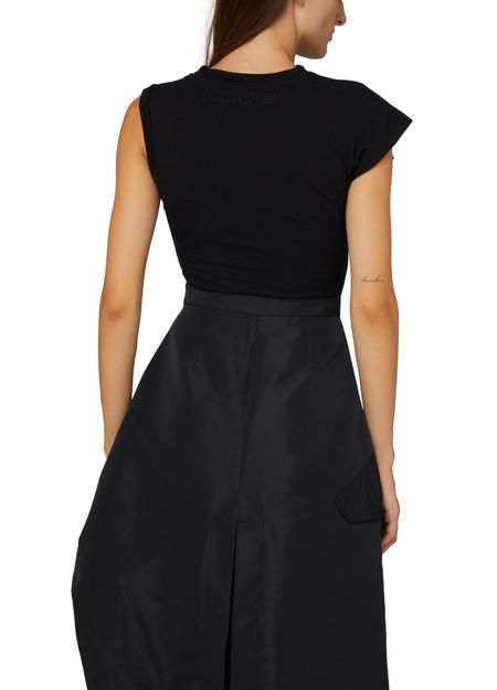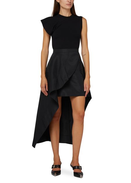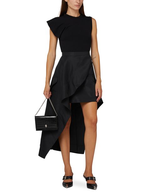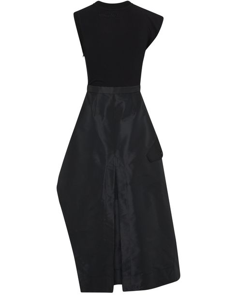 Alexander McQueen's crew neck midi dress features an asymmetric design, with a shorter front and side zipper closure. The back showcases the brand's logo, along with an embroidered logo on the label. Complete with flap pockets, this dress exudes modern elegance and sophistication, ideal for any upscale occasion.