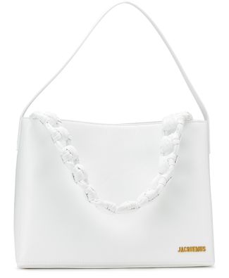 With shiny leather and a classic shape, the large knot bag by Jacquemus is crossed by a leather band tied to resemble links in a chain.