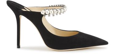 An elegant row of pearls, surrounded by fine crystals, decorates the Bing 100 mules. Their suede design ends on a very thin heel, for an authentic Jimmy Choo look.