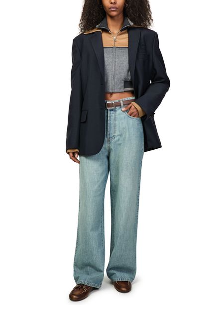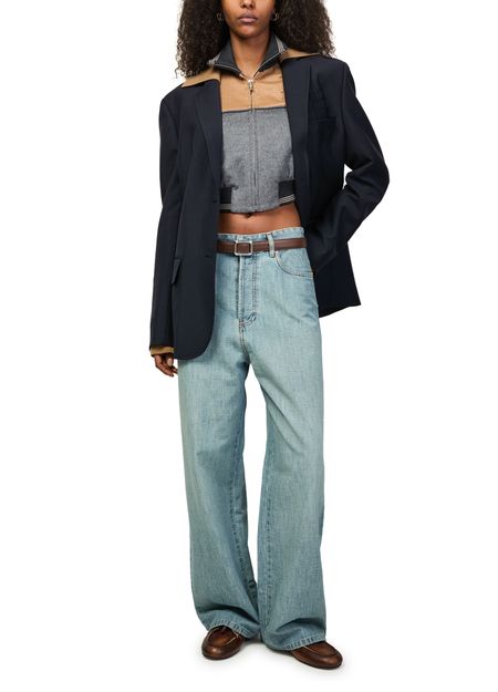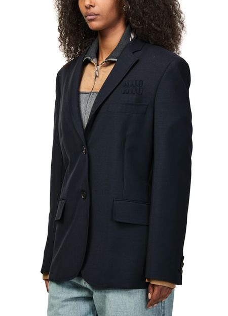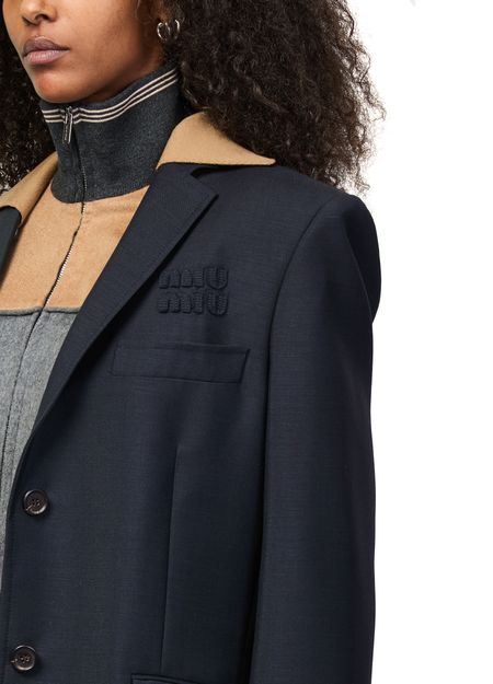 Reveal Miu Miu's blazer with knitted sleeves, a short silhouette featuring a refined collar and long sleeves. The chest logo and flap pockets add a modern touch, while the two-button closure ensures a tailored fit. Perfect for elevating both casual and formal looks with effortless sophistication.