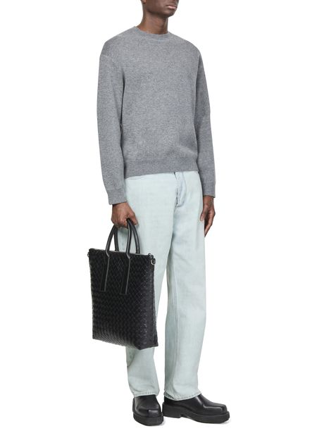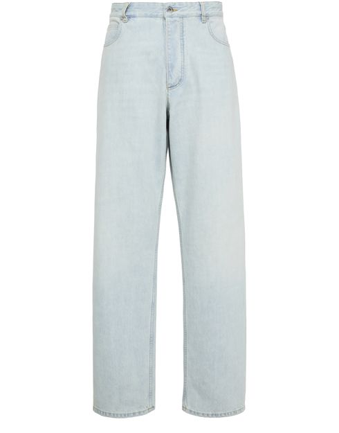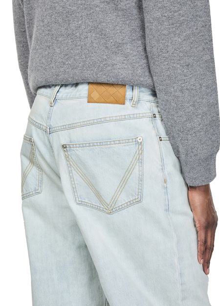 Bottega Veneta's's bleached denim pants showcase a straight cut with below-knee length, perfect for effortless style. The buttoned and concealed zipper closure ensures a sleek finish, while belt loops and five-pocket style add functionality. Visible stitching highlights craftsmanship, and the back leather logo subtly signifies luxury in every detail.