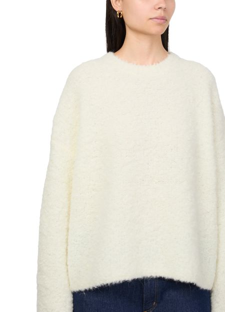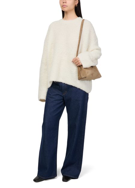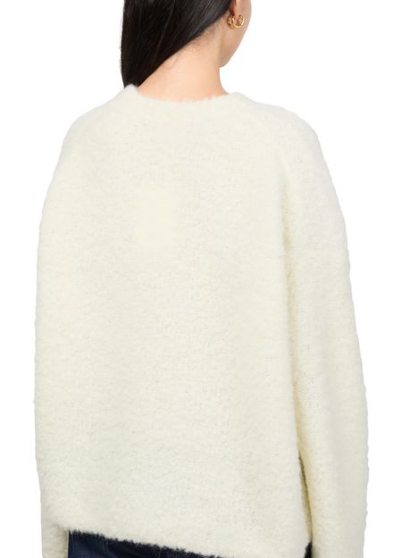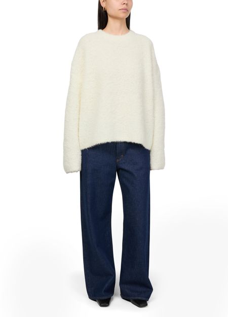 Reveal Toteme's boxy bouclé round neck sweater, a masterpiece in knitwear. This long-sleeved piece features a round neck and raglan sleeves, offering a relaxed yet refined silhouette. The ribbed texture adds depth, making it perfect for layering or standalone elegance. Ideal for both casual and sophisticated ensembles.