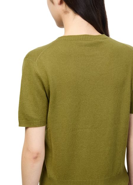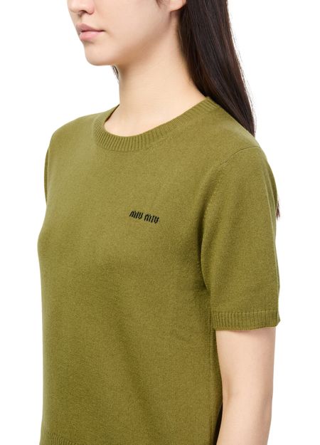 Reveal Miu Miu's cashmere t-shirt, featuring a refined crew neck and short sleeves for a modern silhouette. The embroidered "Miu Miu" logo on the chest adds a signature touch, making this top a versatile choice for both casual and elevated ensembles.