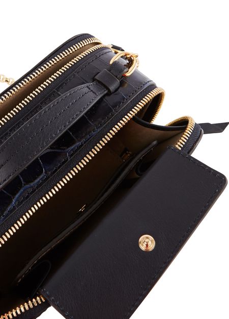 • Description : Mini bag, chain strap, crocodile-embossed leather, leather handle, zippered fastening, metallic logo on the front, worn in the hand, on the shoulder or crossbody.