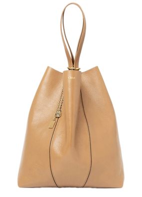 Reveal Chloe's Chloe Spin grained leather tote bag, crafted from supple grained leather with double handles for effortless carrying. Gold-tone charms and a front logo add a refined touch, while visible stitching and a spacious interior compartment ensure both style and practicality for your daily essentials.