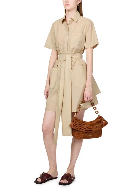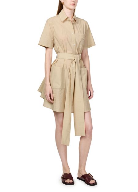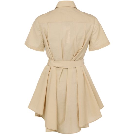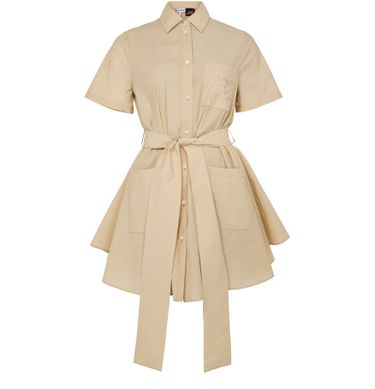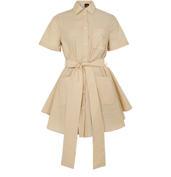 Description : front buttoned closure, visible stitching, shirt collar, flared dress, breast pocket, two front pockets, short-sleeved, embroidered chest logo, detachable belt made from the same fabric, mini dress.