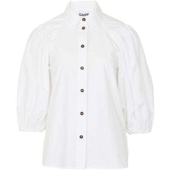 This cotton poplin shirt from Ganni exudes a romantic, boho vibe, brought up to date by the pleated shoulders and gathered sleeves.