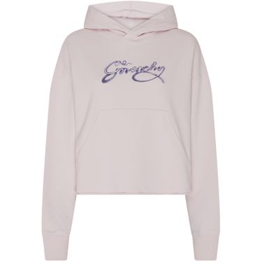 Givenchy's Cropped hoodie in fleece showcases a striking appliquéd logo and an embroidered chest logo, blending style with comfort. Its regular length and long-sleeved design feature cuffed sleeves, while visible stitching adds a unique touch. The hood offers a cozy fit, making it perfect for effortless layering and urban adventures.