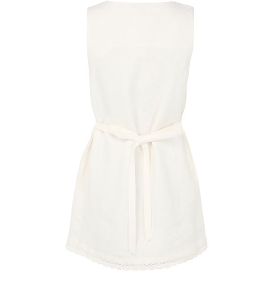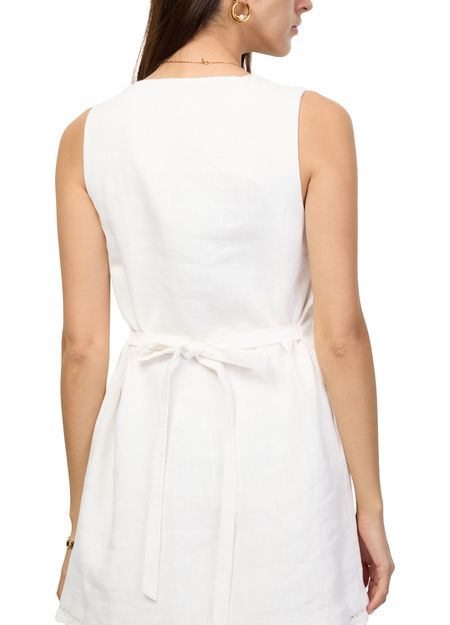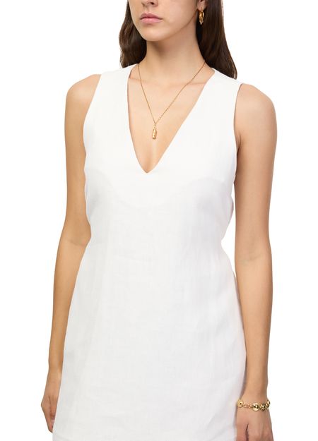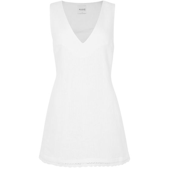 Reveal Posse's Matilda mini dress, a sleeveless silhouette with a flattering V-neck and scalloped edges. This modern piece stands out for its playful cut and refined detailing, making it a versatile choice for both daytime outings and evening events.