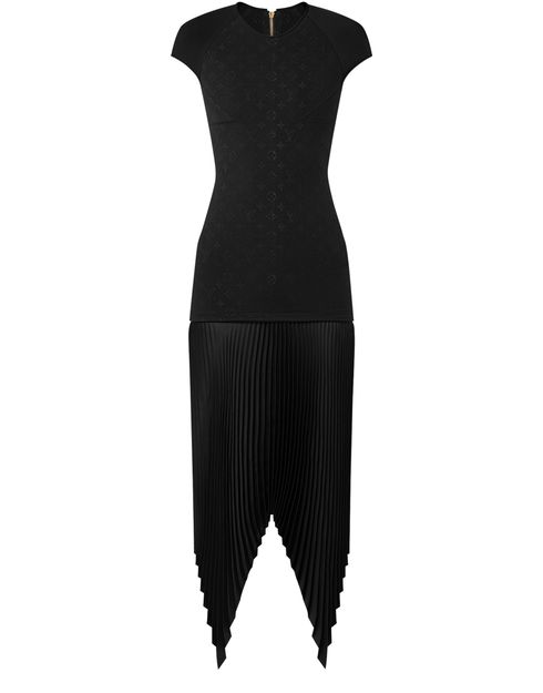This dress is cut in a sleek, modern silhouette from smooth, sculpting technical jersey. The form-fitting top half is discreetly signed with an embossed Monogram motif, while the pleated skirt introduces sophisticated volume and texture, complete with a graphic handkerchief hemline. The back is fastened with an exposed zipper signed with a Monogram canvas pull.