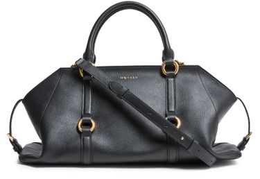 Introducing Alexander McQueen's Farringdon medium handbag, a masterpiece of grained leather craftsmanship. This tote features a spacious interior compartment, a zipper closure, and a front logo in gold letters. The adjustable, detachable strap and double handles offer versatile carrying options, while the visible topstitching adds a refined touch.