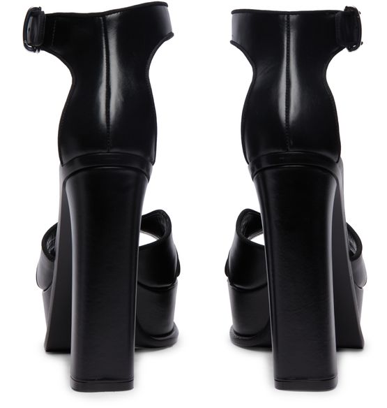 • Description : Open round toe, topstitched edges, buckled ankle strap, graphic cut-outs, platform, block heel, embossed logo insole, metal finishes.