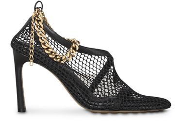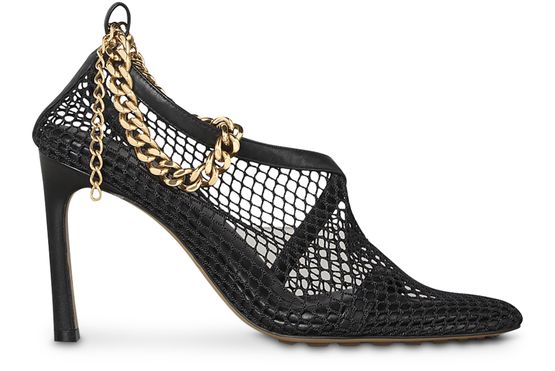 Add a glittering touch to a feminine look with these high-heeled sandals by Bottega Veneta. A fishnet effect accompanies a metallic chain around the ankle.