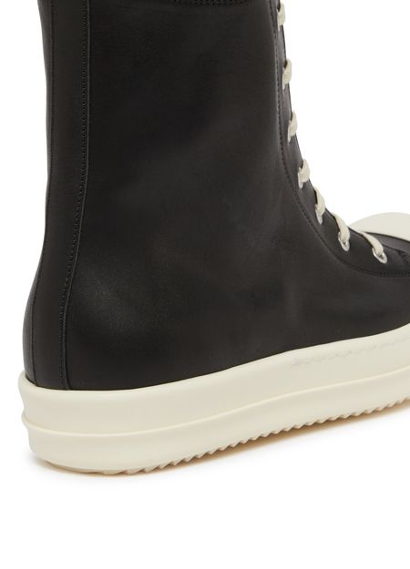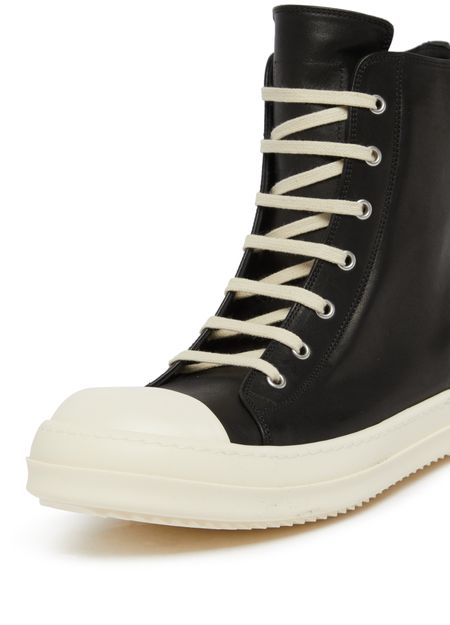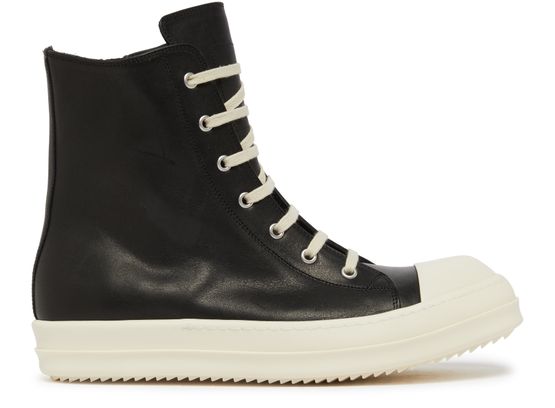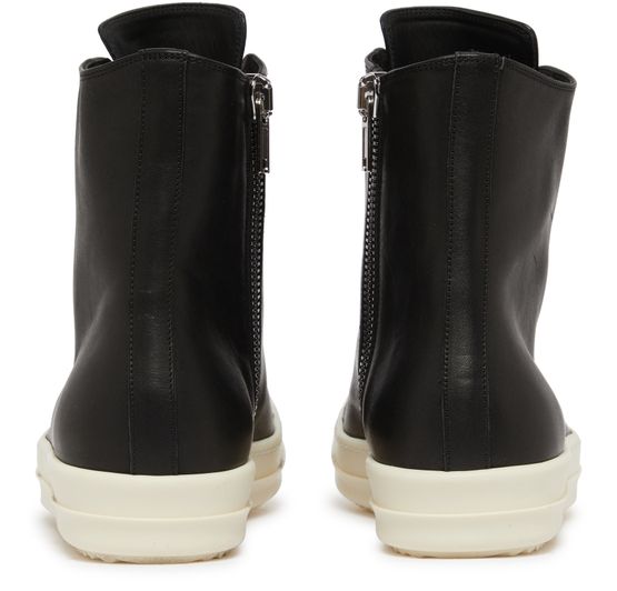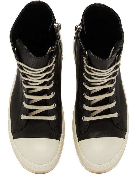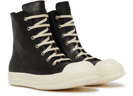 Rick Owens's high-top sneakers showcase a closed design with a round toe, blending style and comfort effortlessly. The visible stitching adds a unique touch, while the side zipper and lace-up feature provide a secure fit. The high-top upper elevates any outfit, making these sneakers a must-have for fashion enthusiasts.