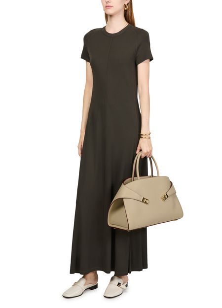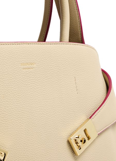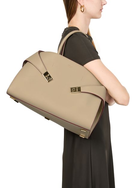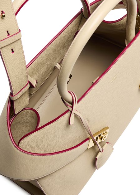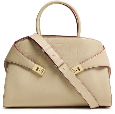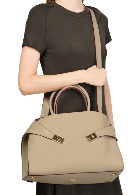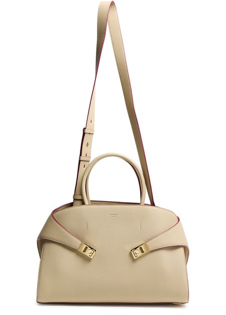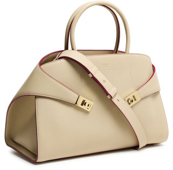 Reveal Ferragamo's Hug handbag (L), a masterpiece of elegance and functionality. Crafted from luxurious leather, this shoulder bag features a twist lock closure and a metallic logo on the front. The adjustable, detachable strap and large interior compartment ensure versatility and ample space for essentials.