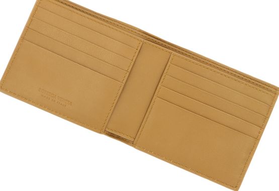 Crafted from supple calfskin leather, Bottega Veneta's wallet features their iconic Intrecciato woven design. The folded structure opens to reveal multiple card compartments, ensuring organization and practicality. With its sleek and timeless aesthetic, this wallet is a luxurious addition to any accessory collection.