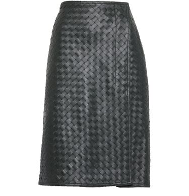 This wrap skirt by Bottega Veneta is crafted from their signature Intrecciato leather, featuring visible stitching and an enlarged version of the iconic woven pattern. The button fastening and straight cut create a timeless silhouette that can be dressed up or down for any occasion.