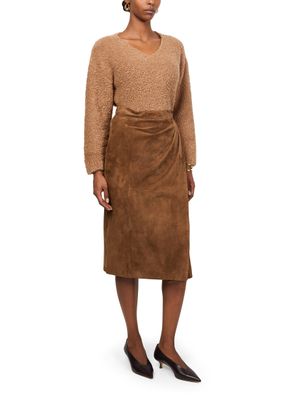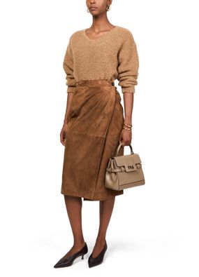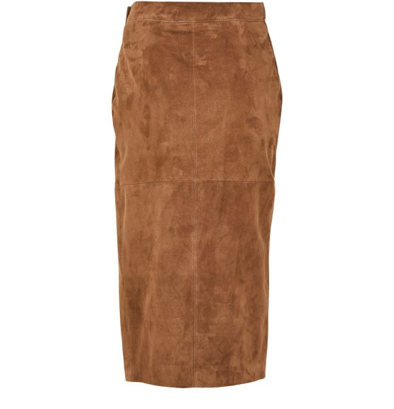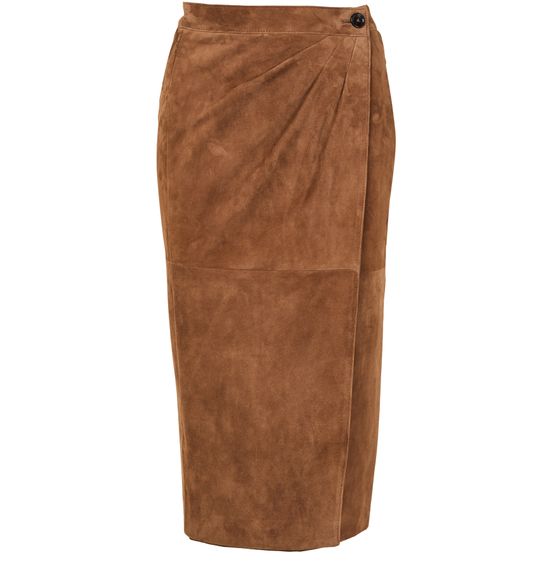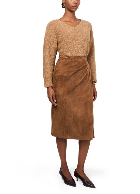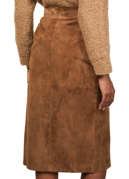 Reveal Max Mara's Jerez midi skirt, a stunning piece crafted from suede. This knee-length wrap skirt features front pleating and visible stitching, adding a modern twist to its asymmetric design. The button fastening ensures a perfect fit, making it ideal for both day and night occasions.
