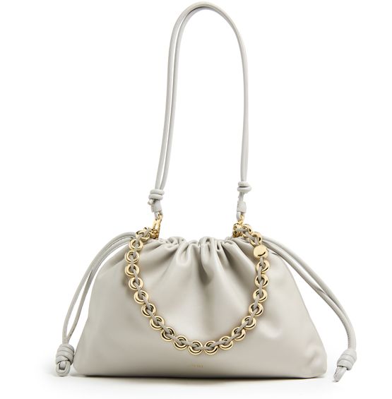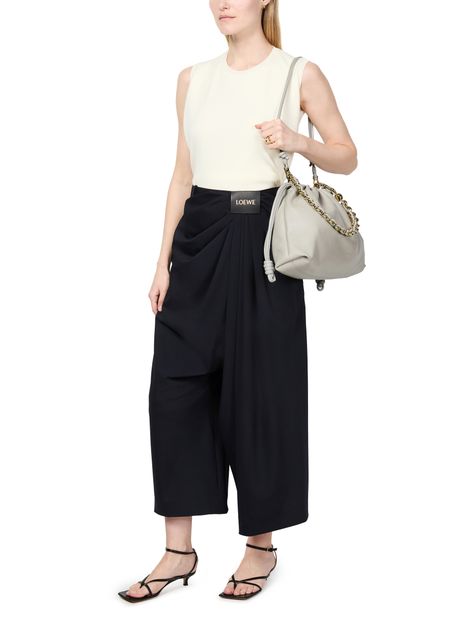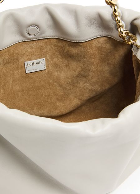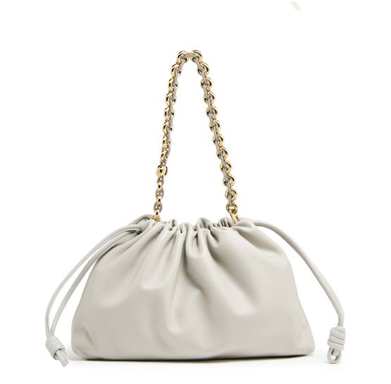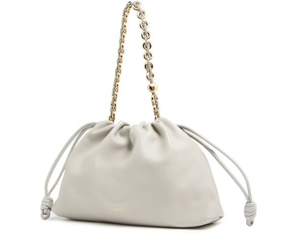 Loewe's Large Flamenco Purse in soft nappa lamb leather boasts a single compartment for effortless organization. Its single handle and detachable strap allow for versatile styling, whether worn on the shoulder or carried by hand. The front logo in gold letters and visible topstitching add a touch of sophistication.