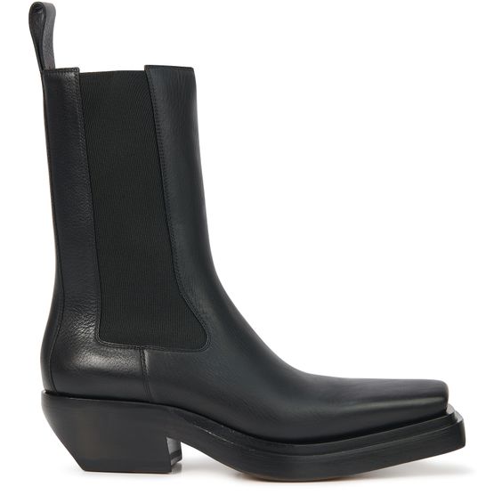 The House of Bottega Veneta is shaking up the traditional fashion codes with these daring square-toed boots. The thick sole supports a high upper that is extended by a long tongue.