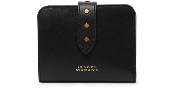 Isabel Marant's leather wallet showcases a sleek design with a snap-button fastening for secure closure. Inside, it features multiple slots for cards, keeping essentials organized. The front logo adds a touch of elegance, while the printed logo and visible topstitching highlight the craftsmanship, making this wallet a stylish companion.