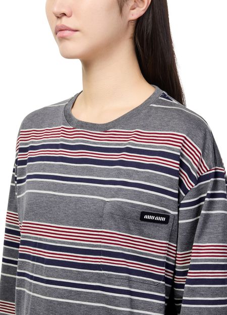 Reveal Miu Miu's long-sleeved striped t-shirt, featuring a classic crew neck and refined cuffed sleeves. The striped print and decorative label with the iconic logo add a modern twist, while the practical breast pocket elevates its everyday appeal. Perfect for versatile, effortless styling.
