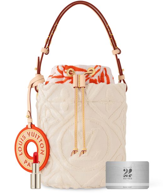 The familiar bucket bag shape takes on an ultra-soft feel in this LVacation Bucket made from organic terrycloth cotton. A jacquard weave creates a lush, dimensional version of the Monogram pattern, with the LV Circle front and center. All the leather details, including the top handle can be removed, and the bag machine washed. The bag is signed with a leather “Louis Vuitton Paris” charm.