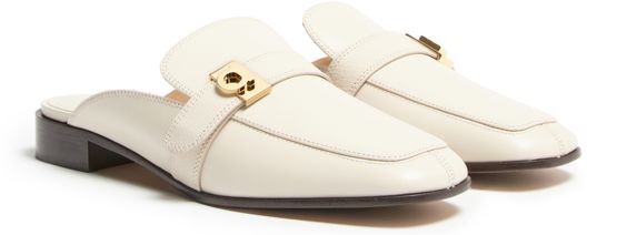 • Description : Mules, logo in gold letters, smooth leather, block heel, low heel, closed, square toe, leather insole, logo-printed insole, logo buckle strap.