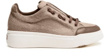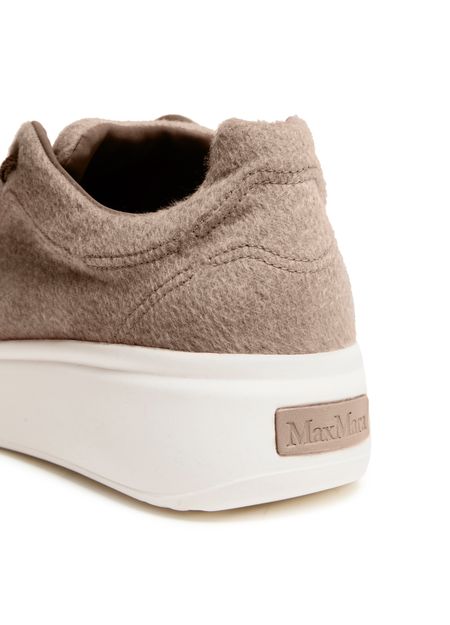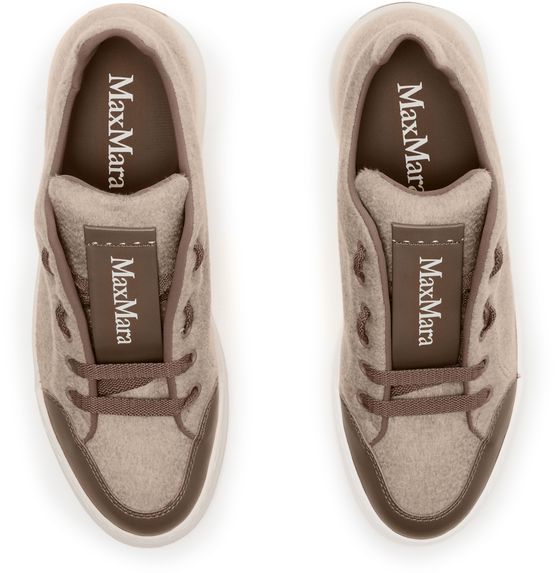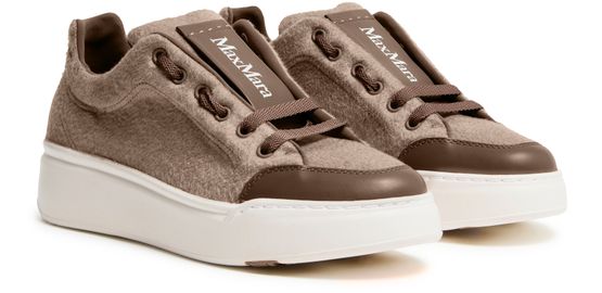Reveal Max Mara's Maxi sneakers, crafted from warm fabric with a platform heel and round toe. The closed design features laces and a strap, complemented by a thick outer sole. Visible stitching and logos on the tongue and back add a touch of sophistication.
