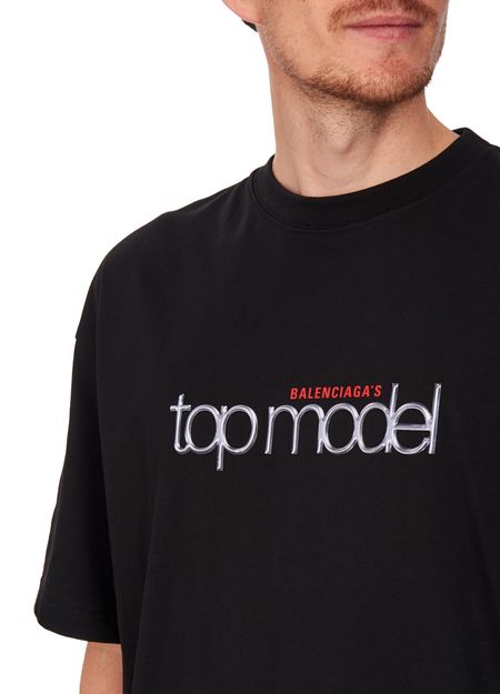 The classic styling of the Top Model T-shirt, which carries the Balenciaga signature, suits every male body shape. As a result, this piece blends into a formal outfit, adding a touch of distinction.